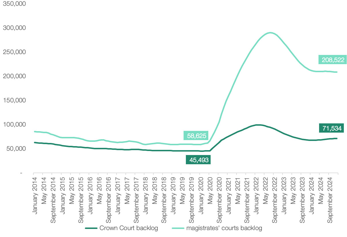 We define the backlog as cases that have been charged but that are waiting to be sentenced. This includes cases waiting to be listed, cases listed and waiting for first hearing, cases waiting for trial, cases actively being tried and awaiting a sentence. This is different from the common definition of cases awaiting for trial, but it is one that is robust enough for analysis and reflects the fact that defendants and victims and witnesses are waiting for outcomes at each of those stages.