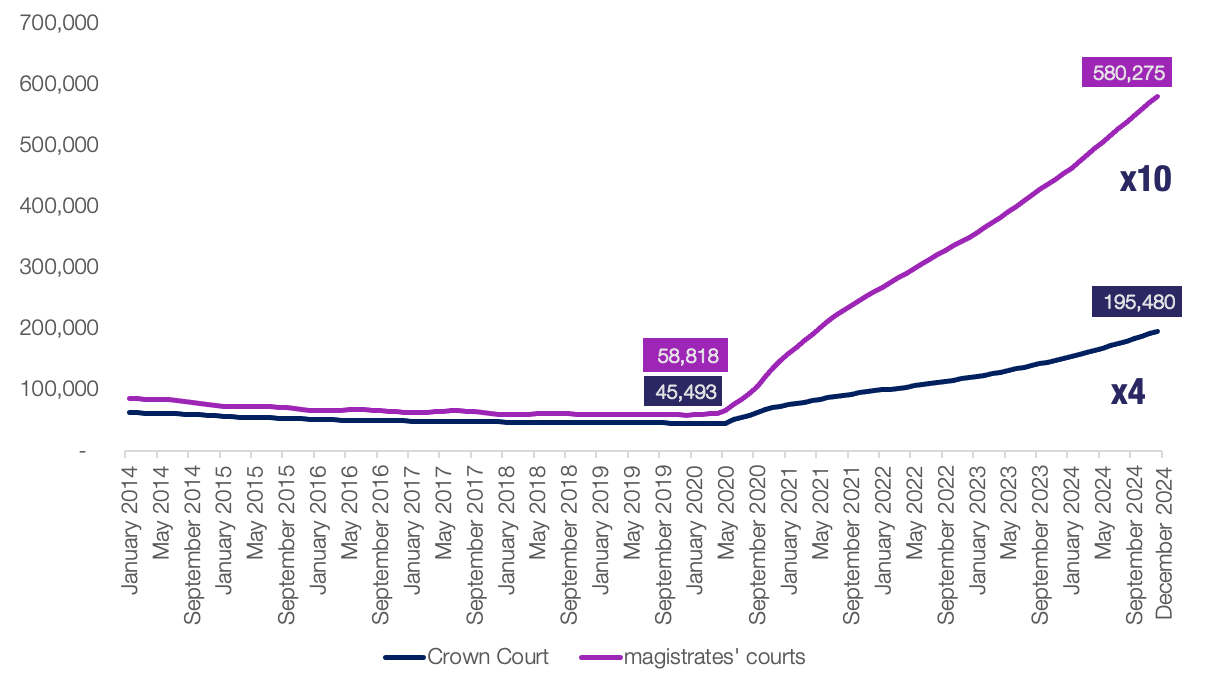 Strong headwinds were already putting pressure on CJS capacity, even before Covid hit. The courts’ backlog (defined as all cases waiting to be listed all the way to waiting for sentencing in the court system) was already significant before the pandemic (104,000 cases). Our modelling also takes into account the following: